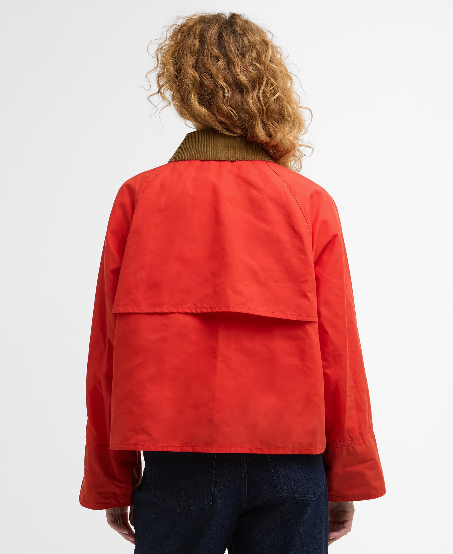 a vibrant, short-style casual jacket made from waxed cotton, featuring classic Barbour details like a corduroy collar, tartan lining, and metal zip pockets, offered in a bold red color for a contemporary yet heritage look. It's a relaxed fit, inspired by Barbour's Spey jackets, known for its durable, dry-handle cotton fabric. LCA0398