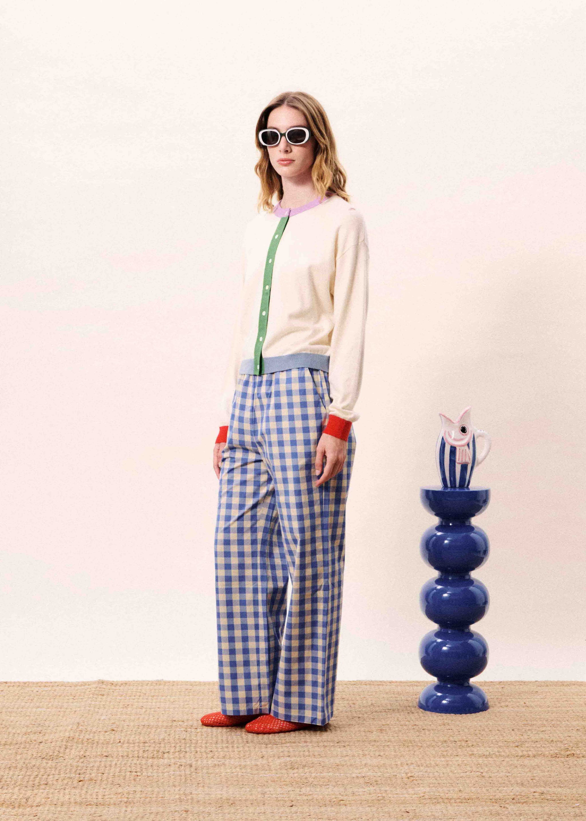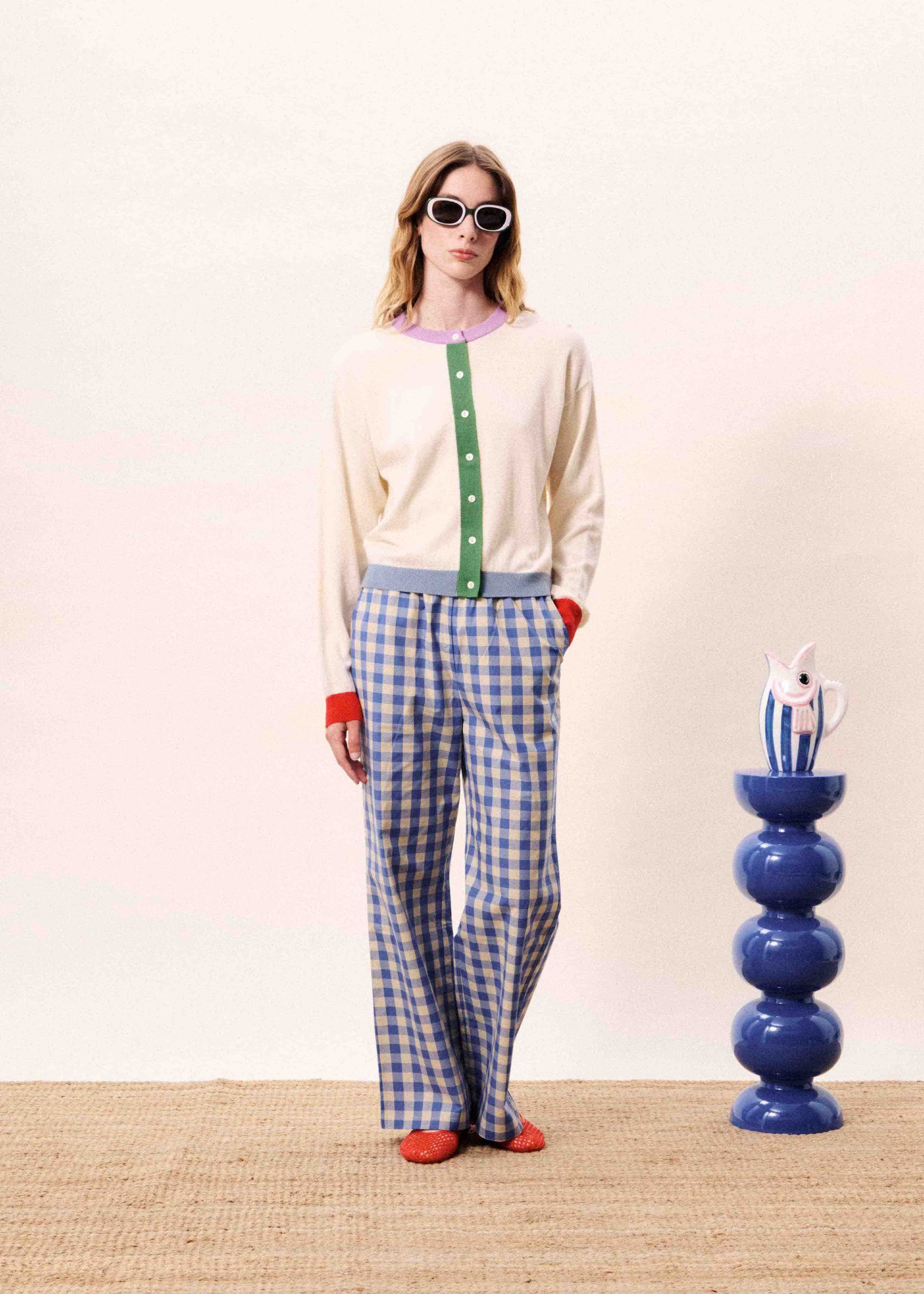Knit cardigan with colourblock details and central button fastening.