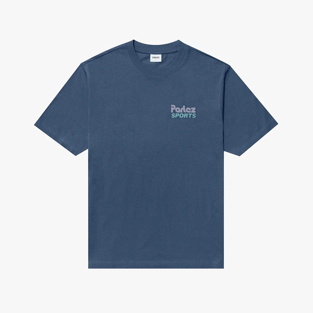 The Burbank T-Shirt in Lagoon. A short sleeve tee crafted from premium GOTS Certified, 100% organic cotton with a classic ribbed crewneck. Detailed with a small, printed logo on the chest and a large design on the back.