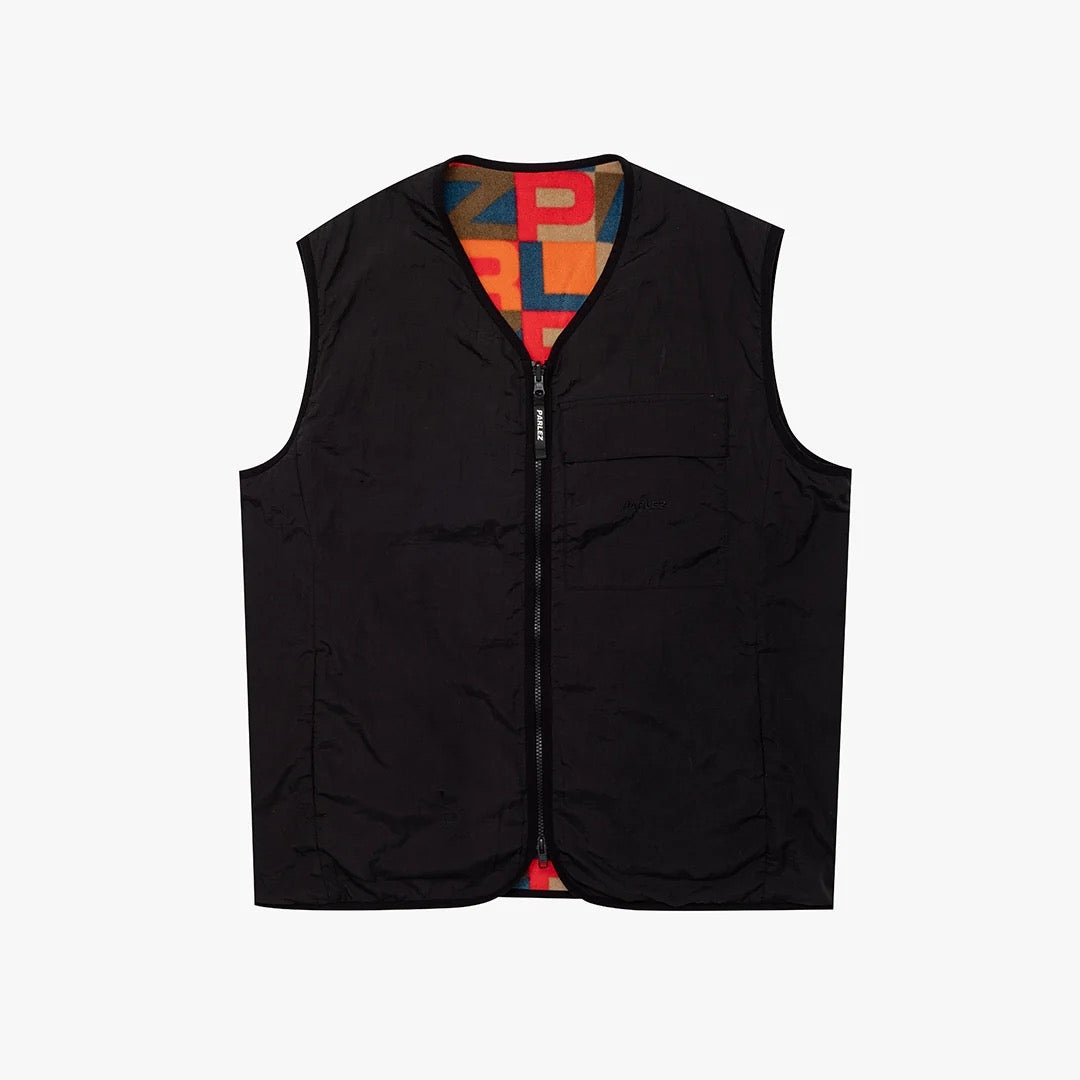 The Zone Gilet in Black/Multi. A lightly padded, reversible gilet made from a 100% recycled nylon outer and 100% recycled polyester fleece on the reverse. Featuring two-way zip closure, exterior and interior nylon patch pockets and taped edges. Detailed with a branded zip pull.