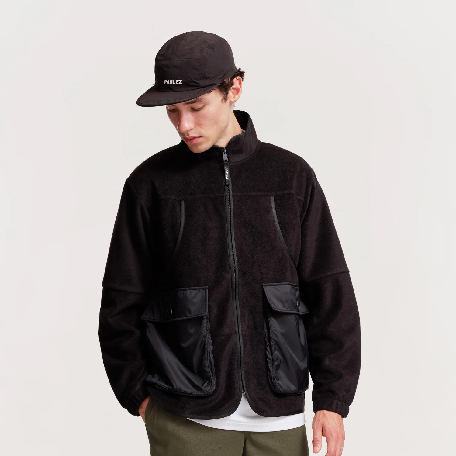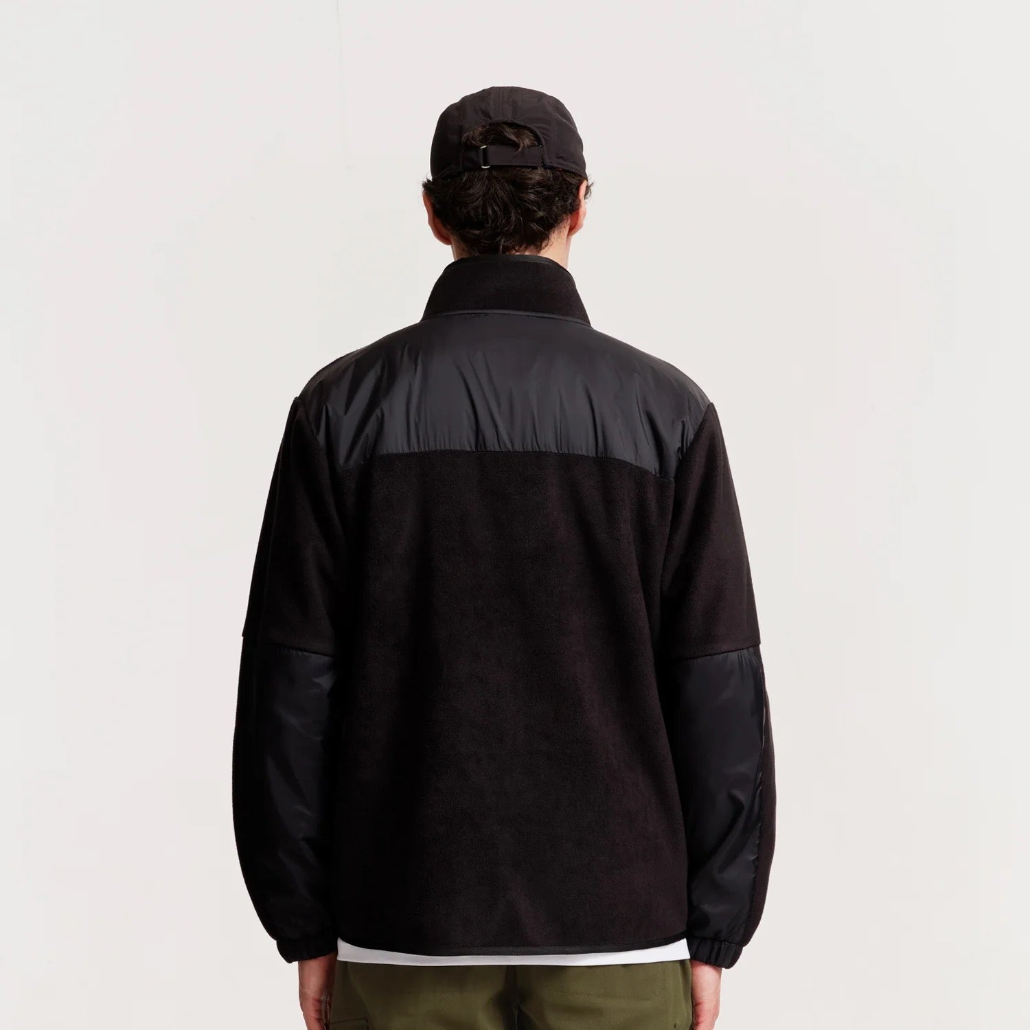 The Summit Fleece in Black. A zip-through jacket made from 100% recycled polyester with tonal nylon panelling. Featuring two large cargo pockets, herringbone tape binding, a stand collar and elasticated cuffs. Detailed with a branded zip pull.