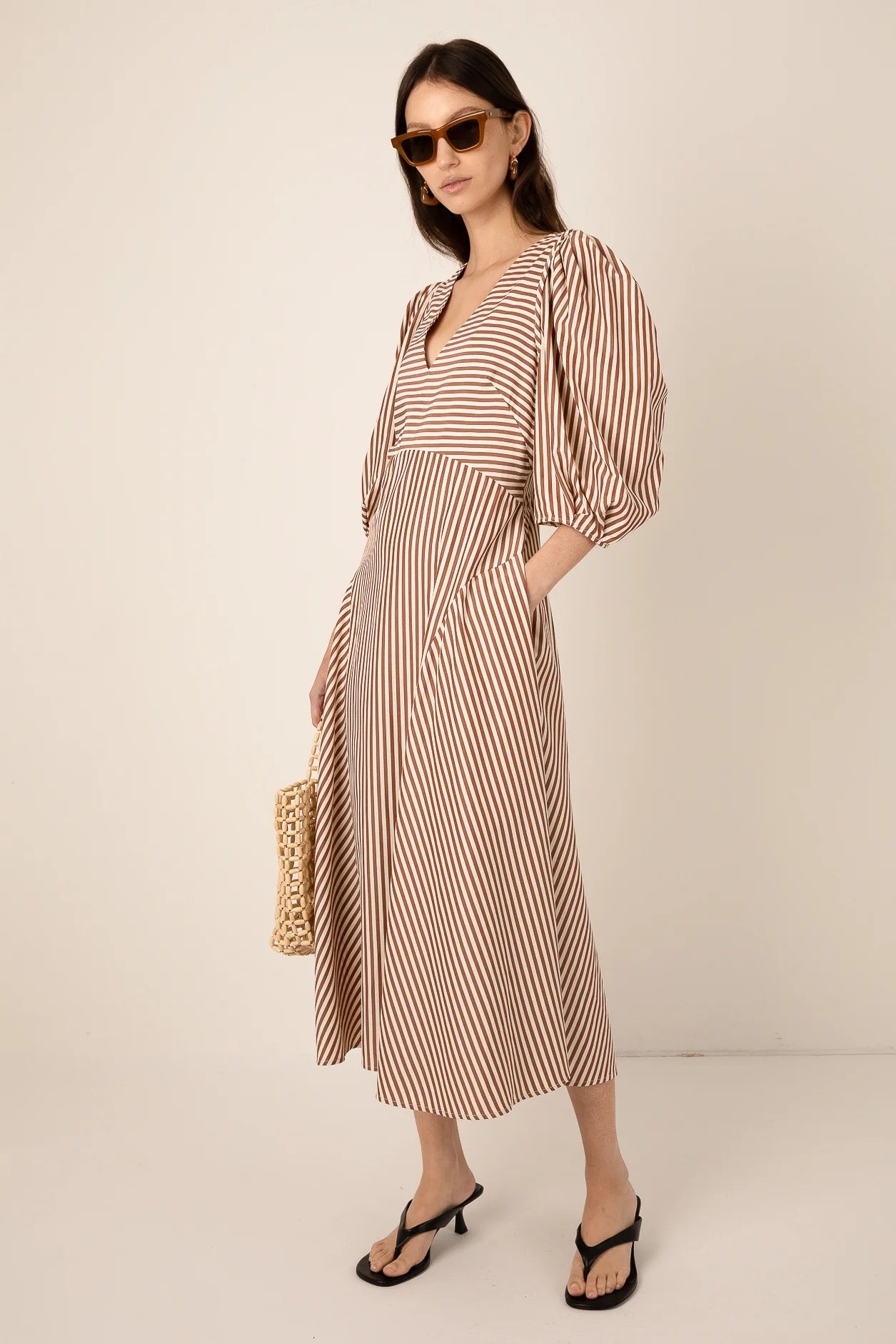 A sophisticated striped midi-dress with a deep V-neckline, softly gathered puff sleeves, and a fluid A-line silhouette. The Mila Brown Stripe dress is the perfect transitional piece for your Spring-Summer wardrobe.