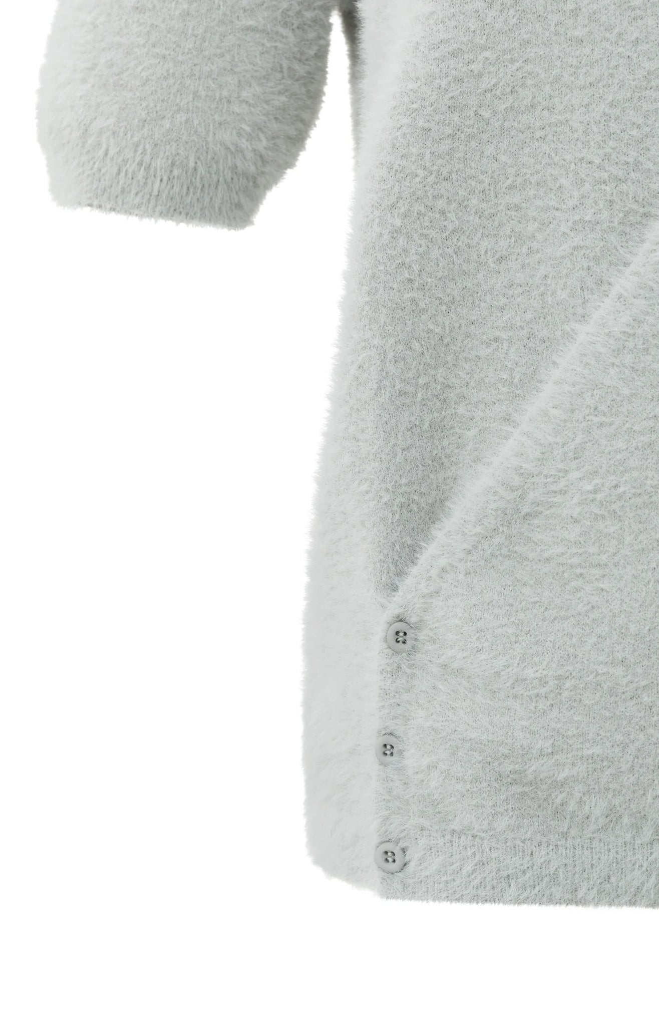 This soft fluffy sweater features short sleeves, a round neckline and a playful wrap-over detail with button closure on the side. The diagonal line and subtle cut-out near the collar add a modern twist. With its regular fit and comfortable feel, this piece is perfect for a feminine, casual look. The model is 175 cm and wears size S.