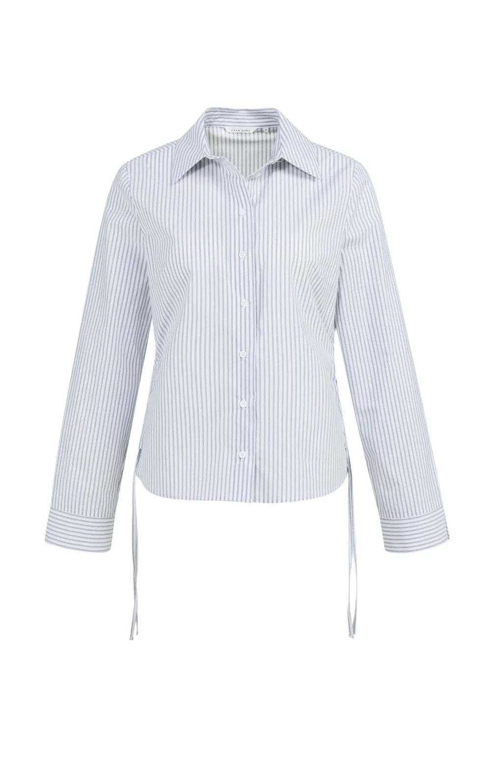This striped blouse features a fitted silhouette, classic collar, and long sleeves with wide cuffs. The drawstrings at the sides allow you to adjust the waist for a flattering fit. Subtle contrast in stripe direction at the cuffs adds a refined detail. A stylish piece perfect for both office and casual wear. The model is 175 cm and wears size 36.